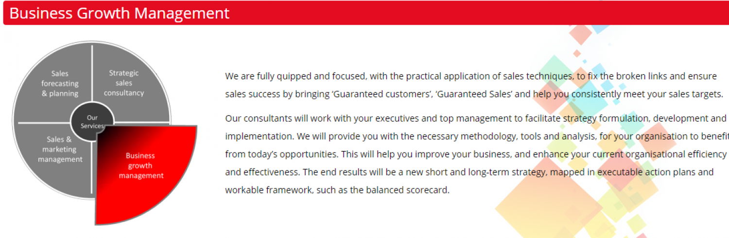 We are fully quipped and focused, with the practical application of sales techniques, to fix the broken links and ensure sales success by bringing ‘Guaranteed customers’, ‘Guaranteed Sales’ and help you consistently meet your sales targets. Our consultants will work with your executives and top man...